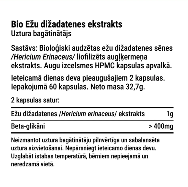 Ekstraktā izmantotas tikai Latvijā bioloģiski audzētas ežu dižadatenes sēnes. Ekstrakts ražots no 100% ežu dižadatenes augļķermeņa.