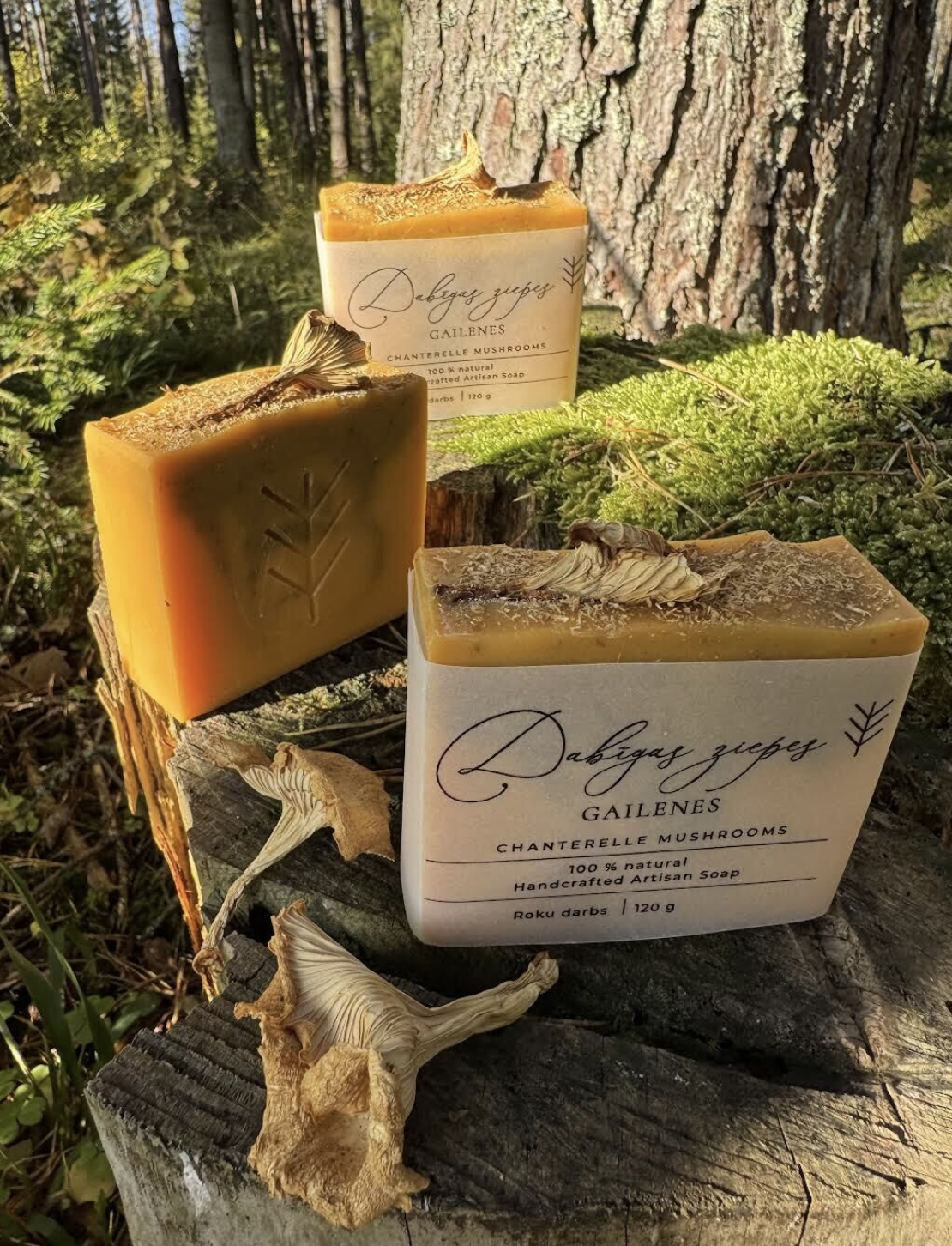 Gailenes ziepēs! Arī tā var būt :) Sēnes gūst aizvien ievērojamāku ievērību kosmētikas nozarē, pateicoties to bagātīgajiem bioaktīvajiem savienojumiem, kas sniedz daudzus ieguvumus ādai – uzlabo ādas mitrināšanu un elastību, nodrošina aizsardzību pret oksidatīvo stresu un UV starojuma negatīvo ietekmi. Piemēram, gailenes ir bagātīgs polisaharīdu avots, kas palīdz aizsargāt šūnas no bojājumiem un stimulē jaunu šūnu veidošanos. Ziepes ir ļoti, ļoti maigas un mīkstinošas. Ēteriskās eļļas piešķir ziepēm svaigi rūgtenu rudens meža aromātu.