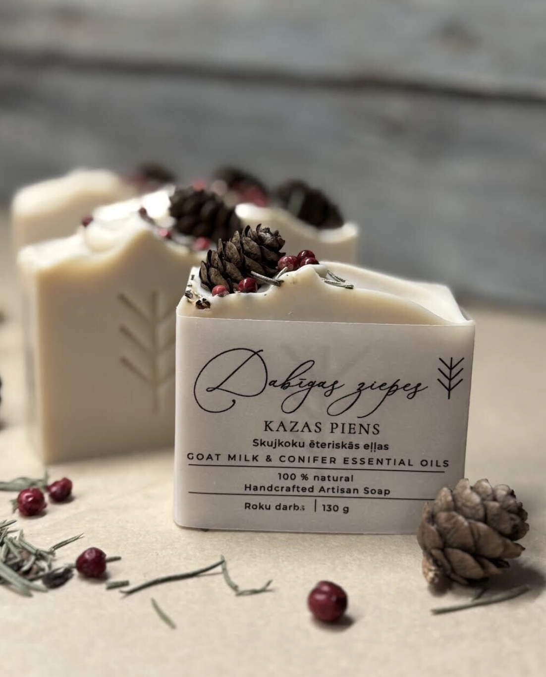Maigas un kopjošas ziepes ar meža aromātu. Ziepes gatavotas no augstvērtīgām eļļām un taukvielām un dabīga kazas piena, kas nomierina un dziļi mitrina ādu. Pēc mazgāšanās ar kazas piena ziepēm, āda jūtas svaiga, attīrīta, maiga un elastīga, bez liekas taukainuma sajūtas. Skujkoku ēteriskās eļļas piešķir ziepēm patīkamu meža aromātu, svaigumu piešķir papildus pievienotās eikalipta un piparmētras ētersikās eļļas.