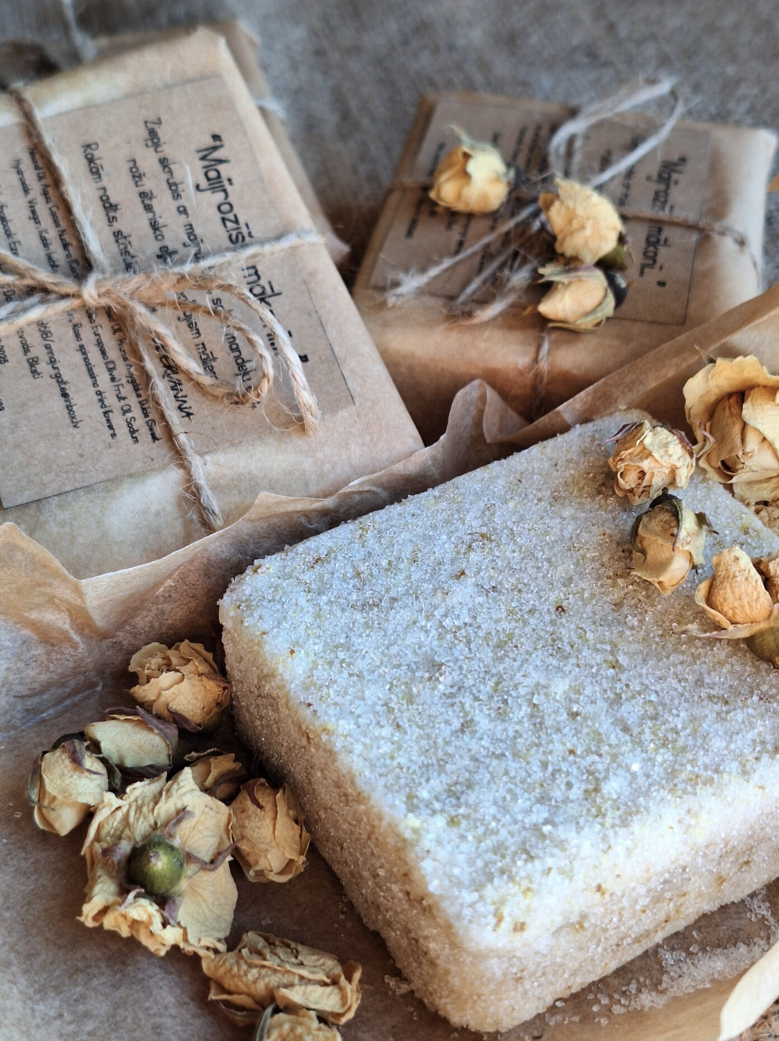 Ziepju skrubis ar maijrozītēm, saldo mandeļu eļļu, rožu ēterisko eļļu un baltajiem māliem